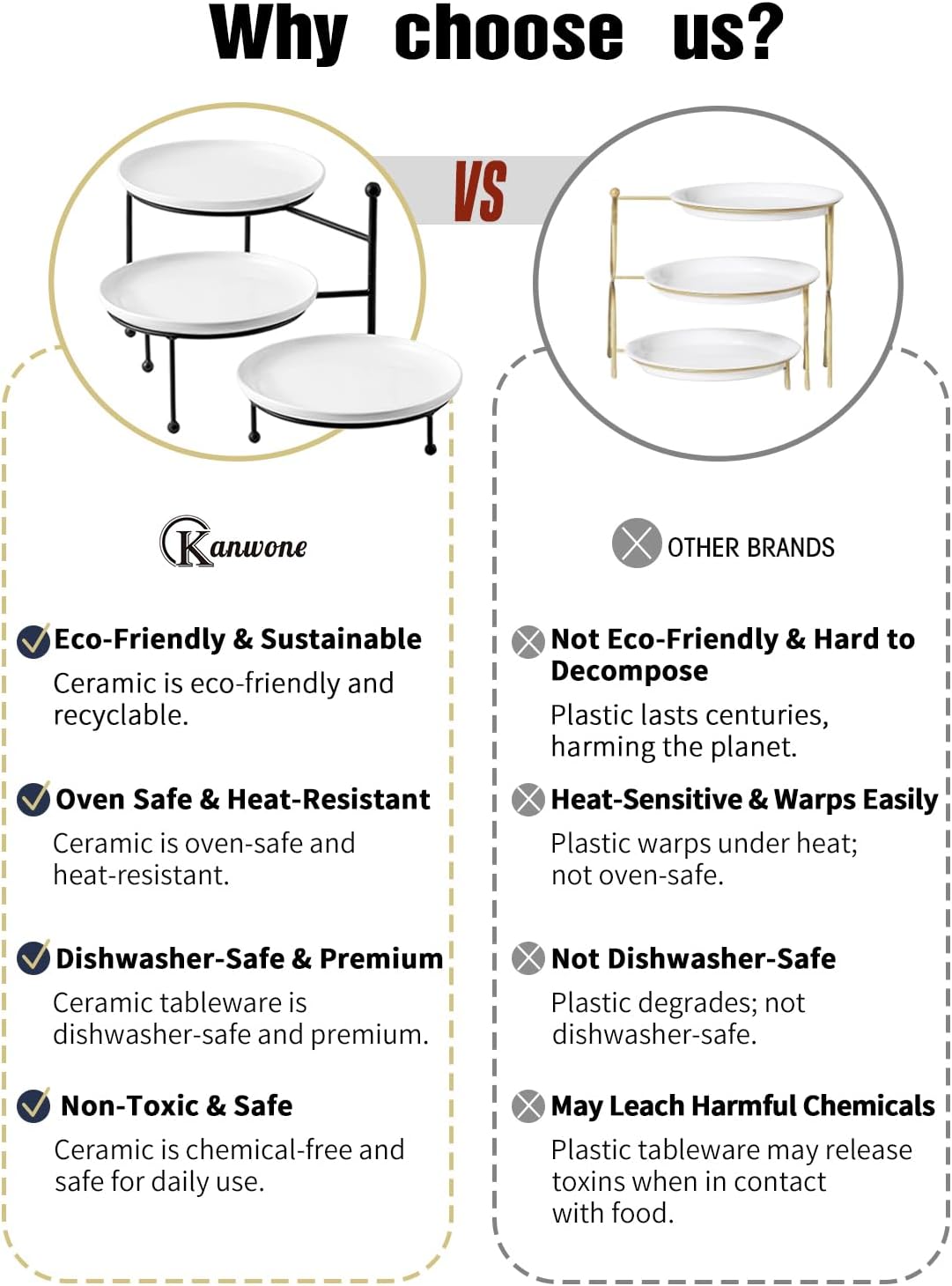 Kanwone 3 Tiered Serving Stand with White Porcelain Plates, 10" Round Tray, Dessert Table Display Set, Black Metal Stand, Versatile & Durable